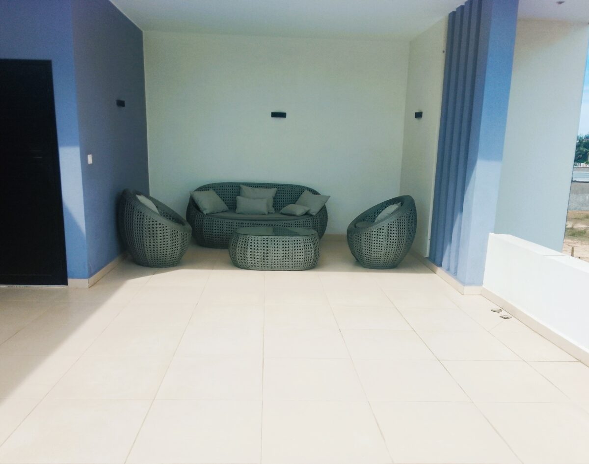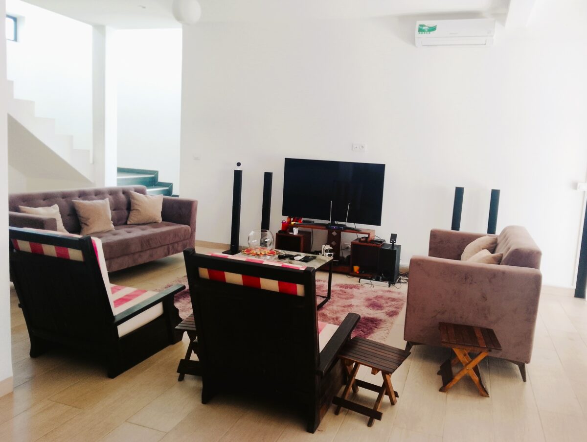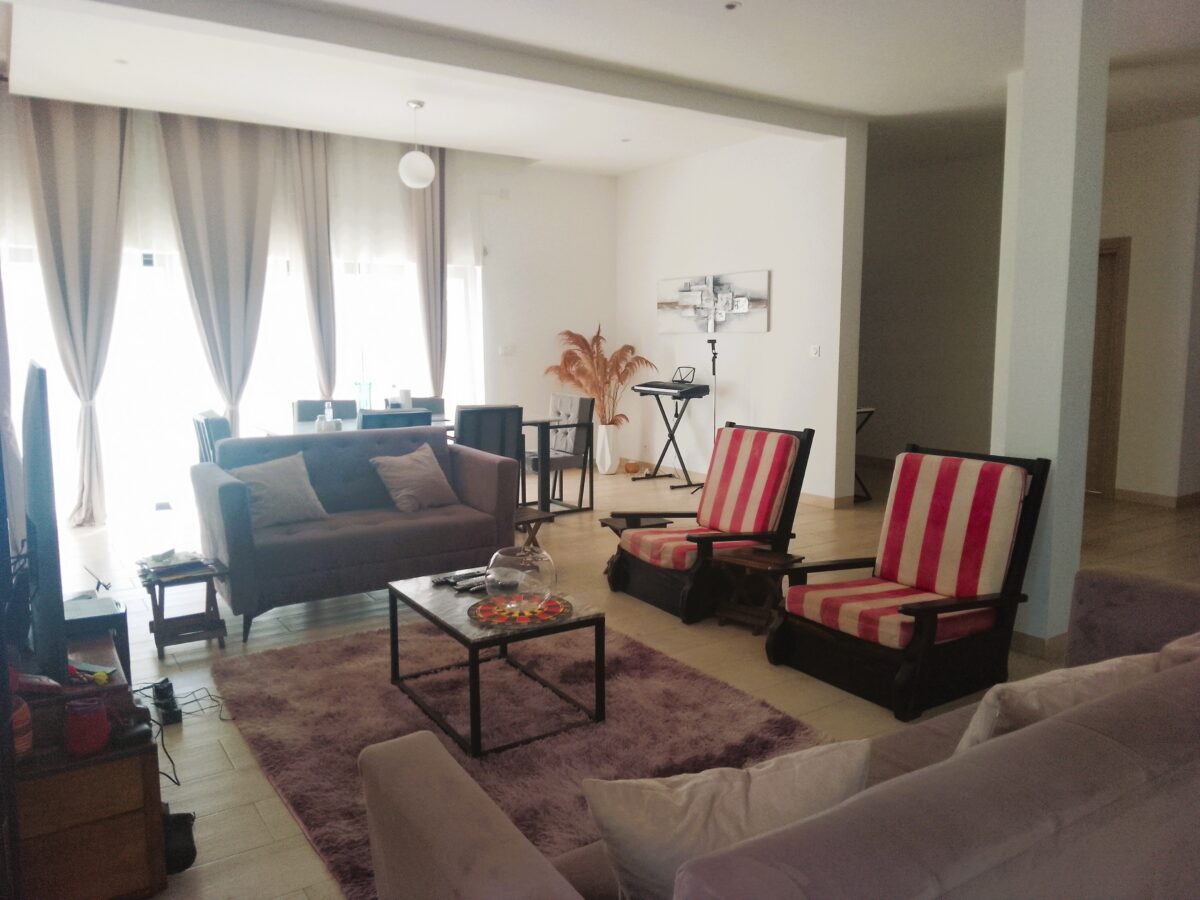 Le rez-de-chaussée comprend deux belles chambres climatisées, chacune avec sa propre salle d’eau et WC, un séjour lumineux ouvert sur la salle à manger, ainsi qu’une cuisine entièrement équipée.